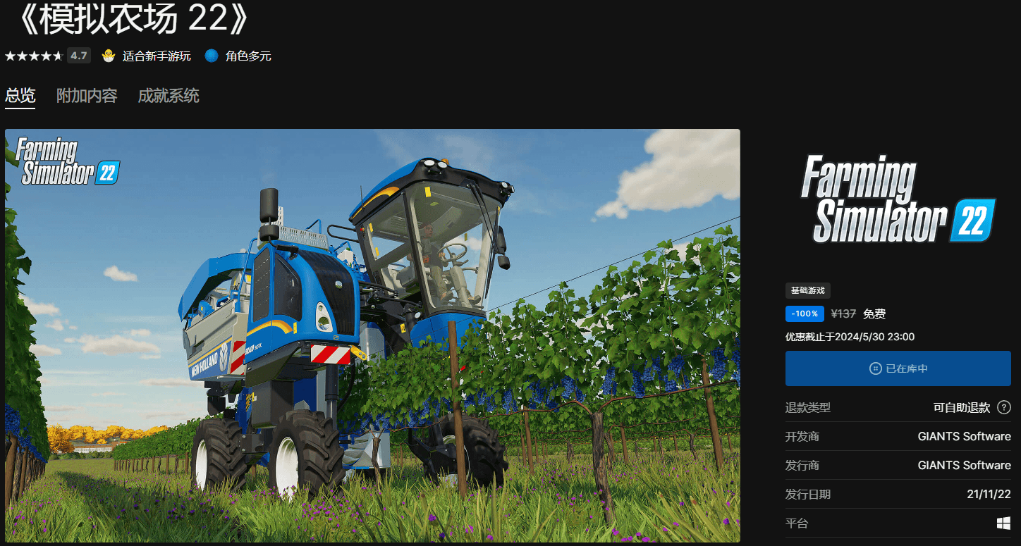 领取地址:https://store.epicgames.com/zh-CN/p/farming-simulator-22